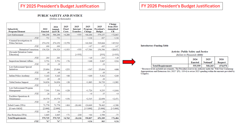 The FY 2025 Congressional Budget justification for Bureau of Indian Affairs and Bureau of Indian Education and the previous justifications for at least the last 3 decades included the budget Activity (Public Safety and Justice), the Subactivity (Law Enforcement) and Program Elements (Criminal Investigations and Police Services, Detentions and Corrections, Tribal Courts, etc). This information is necessary for Tribes and Congress to assess the Administration’s proposal and understand the level of funds they will receive to conduct contracted and compacted activities. The FY 2026 Budget Justification only provided a total amount of funding for all of Public Safety and Justice. The image below shows the change in level of detail.