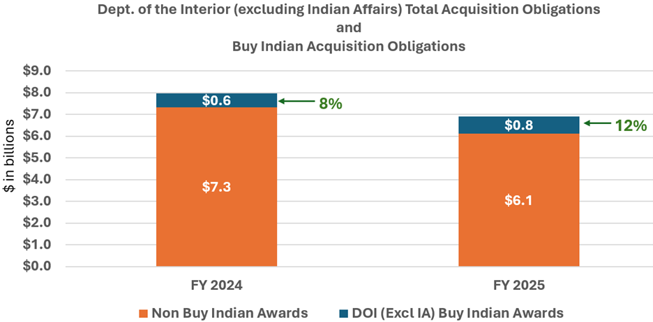 It helps if we dive a bit deeper into the data and focus on acquisition obligations for Interior bureaus outside of Indian Affairs. Interestingly, other Interior bureaus actually increased their Buy Indian Act obligations in FY 2025 by over $170 million, despite an overall reduction in total obligations. Difficult to pinpoint why, if I had to guess, it's likely some bureaus used Indian Affairs smart acquisition vehicles for construction purposes – one or two projects in this area can result in a big change in obligations. But it could be due to other factors. These acquisition vehicles have been well received by other Interior organizations and can also be used by the Indian Health Service.