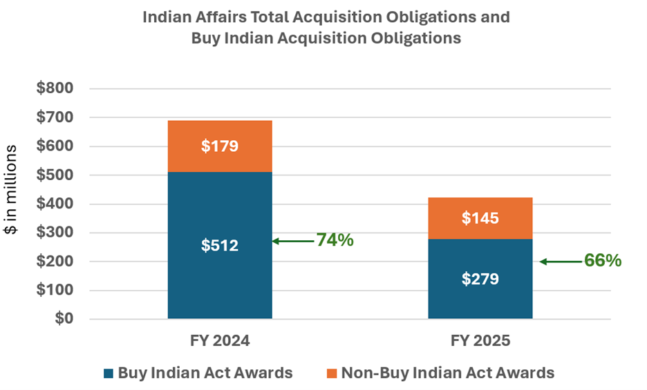 While overall obligations decreased, the percentage of total Buy Indian Act obligations compared to total obligations increased in FY 2025. This may be a good sign that the smart acquisition vehicles created by Indian Affairs remain a strong option for managers across the Interior to support effective operations. Additionally, the tools and education provided by Indian Affairs to vendors such as the Buy Indian System for Award Management continue to help Indian Economic Enterprises identify procurement opportunities.