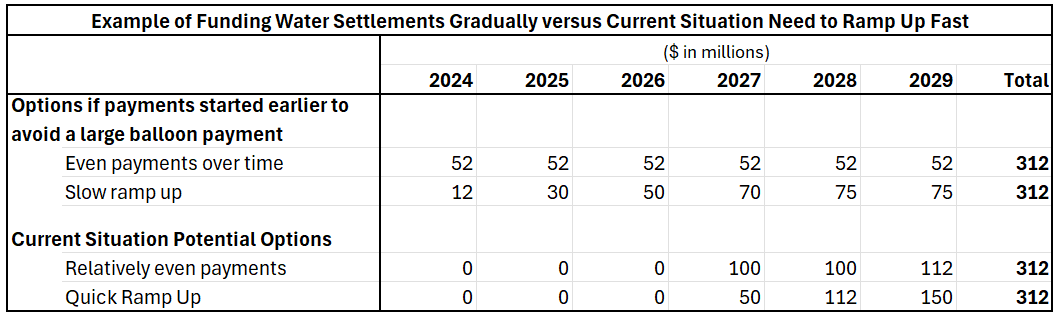Providing additional funding for Indian water rights settlements is challenging when there are other major costs to be funded, as I’ve mentioned with Contract Support Costs and 105(l) leases, combined with a constrained budget. For context, $312 million is 7.8% of the Bureau of Indian Affairs budget. The cost will go up once final indexing (inflation payment) is calculated. The chart below shows that gradually building in water settlement costs can be more manageable, especially within the Interior and Environment appropriations bill, which is less likely to receive surges in funding than other appropriations bills. Given that no noticeable amounts have been appropriated, current options illustrate that a lot of money will be needed over the next three fiscal years.