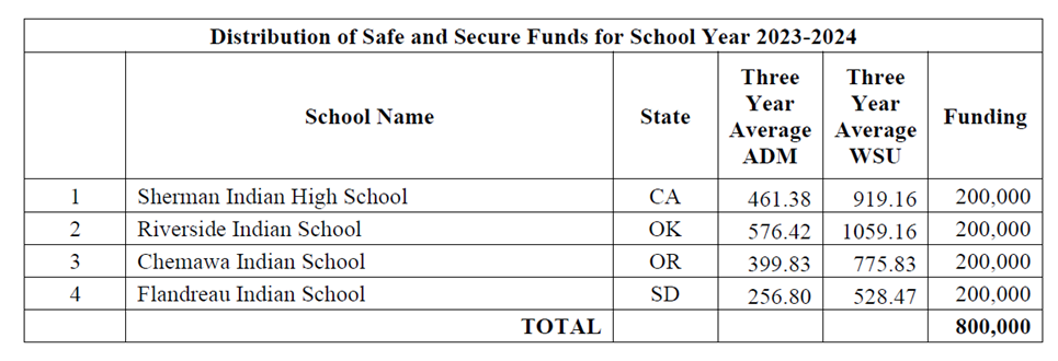 This table highlights funding provided to school programs identified as having high safety and security issues. These schools utilize the funds to support police and security services at off-reservation boarding schools with unique at-risk student populations and proximity to urban centers.